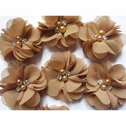 20 Chiffon Silk Flower Rhinestone Pearl 2" - Pale Gold