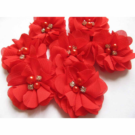 20 Chiffon Silk Flower Rhinestone Pearl 2" - Red