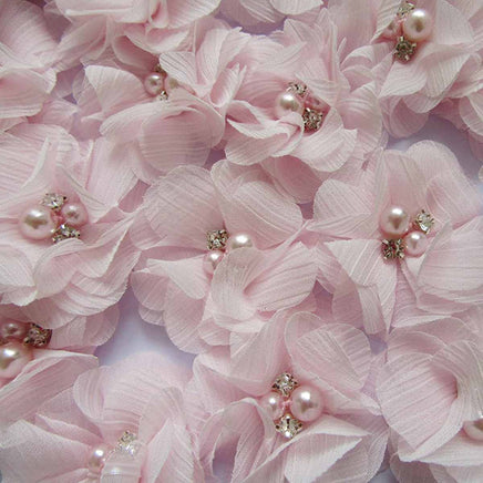 This lovely flower has layers of chiffon folded beautifully and finished off with a large and small pearl the same color as the flower, as well as a duo of round rhinestones. Each flower has a round felt circle on the back.