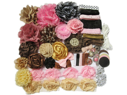 For this kit,the main colors are Brown,Tan and Black.It includes Hair Flower,Elastic,Felt Circles,Rhinestone Buttons,Grosgrain Clips and some Free Gems! (we also have other colors to choose from