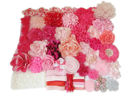 For this kit,the main colors are Pink,Hot Pink and Red Colors.It includes Hair Flower,Elastic,Felt Circles,Rhinestone Buttons,Grosgrain Clips and some Free Gems! (we also have other colors to choose from